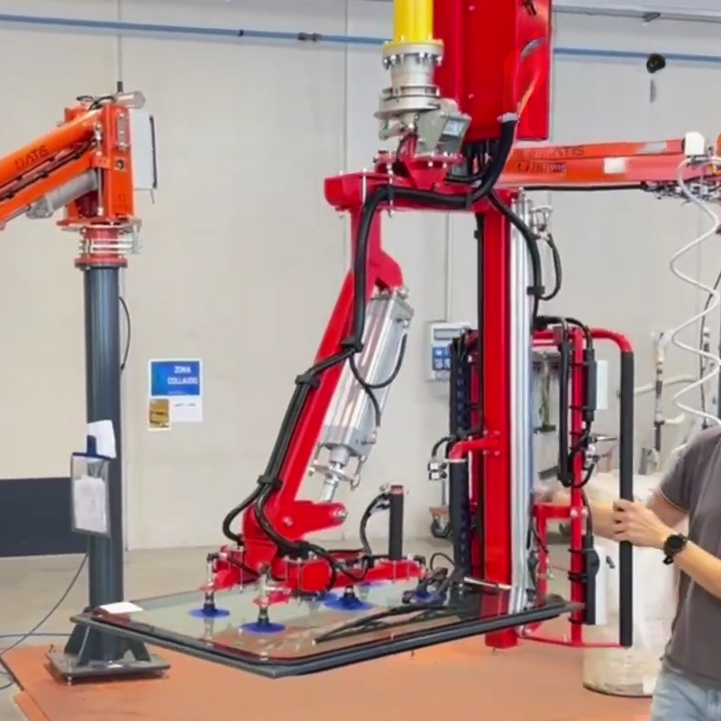 Pneumatický průmyslový manipulátor ATISmirus, s pokročilým systémem přísavek a nosnosti až 300 kg umožňuje zvedání, otáčení a naklápění skleněných desek...