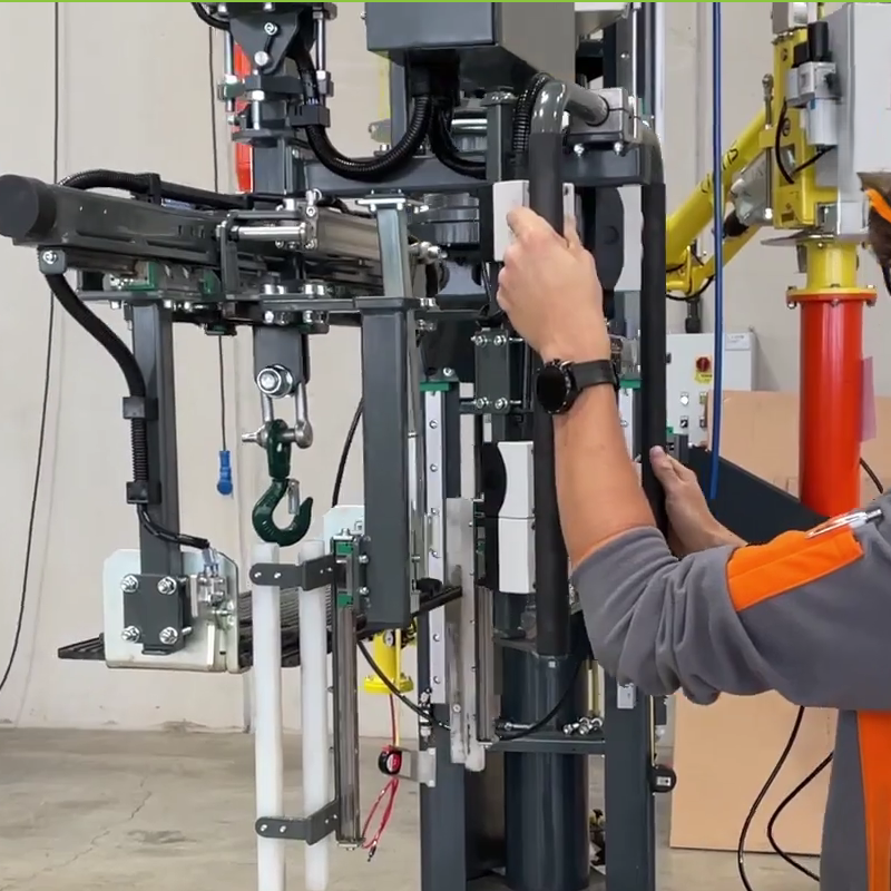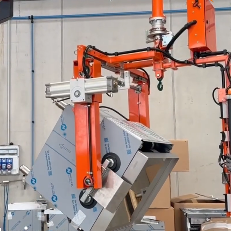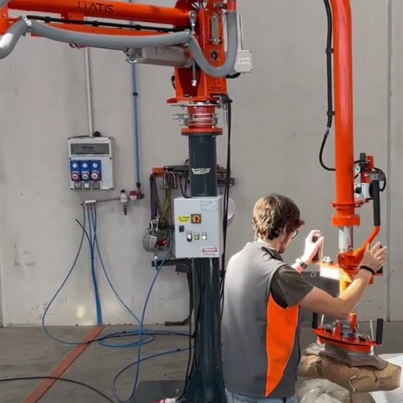 Průmyslový manipulátor, uzpůsobený pro zvedání velkých pytlů. Zvláštní je uchopovací systém s ovládacími prvky ve dvou výškách pro pohodlnou a...